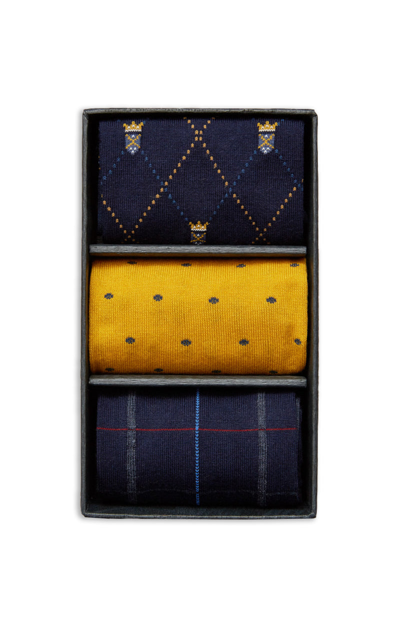 MARCOLIANI CALF SOCK GIFT BOX OF 3 - NAVY/GOLD MIX