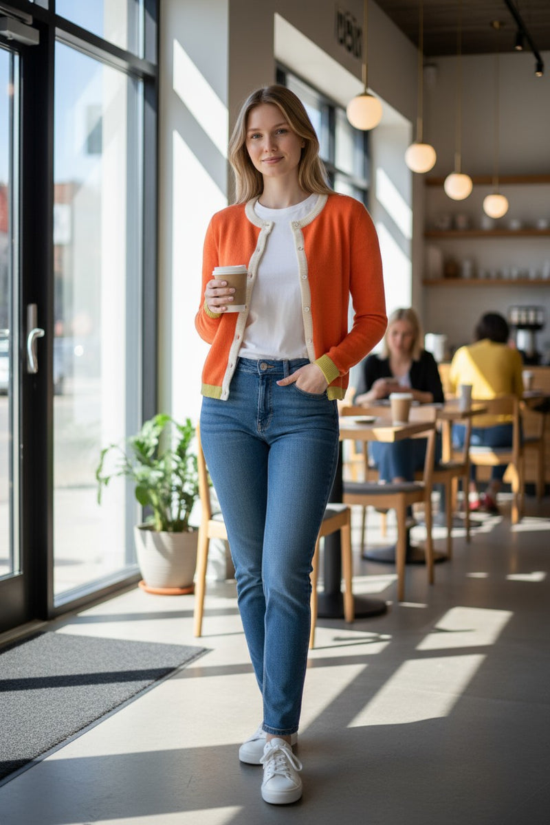 IN BED WITH YOU WOOL CARDIGAN - ORANGE WITH YELLOW & WHITE TRIM