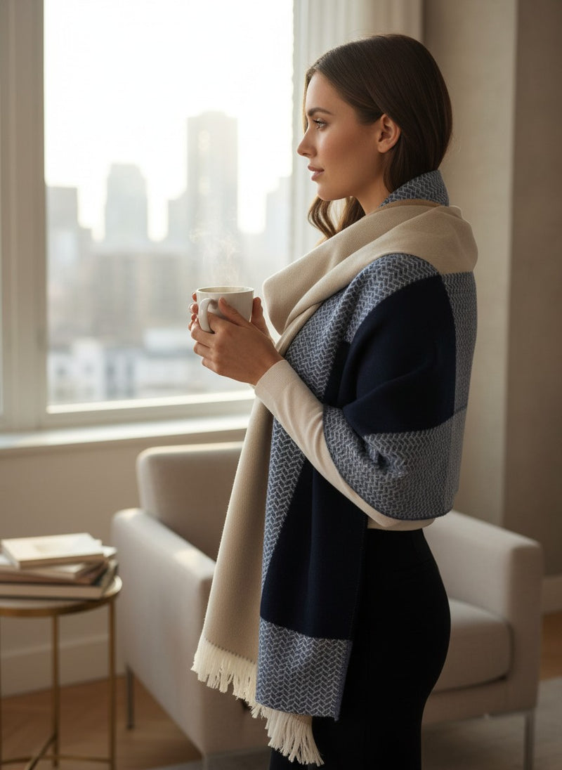JOHNSTONS OF ELGIN MERINO WOOL COLOR BLOCK WOVEN THROW - NAVY