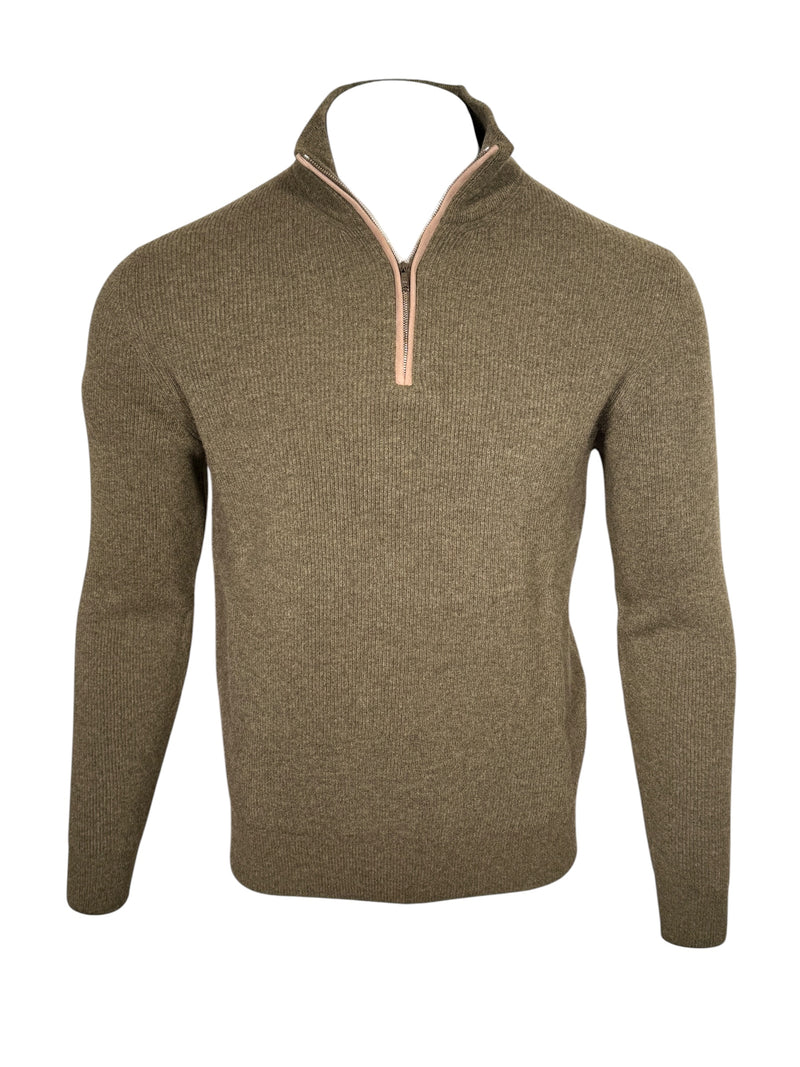 FIORONI CASHMERE MEN'S SUEDE TRIM RIBBED 1/4 ZIP SWEATER - BORNEO