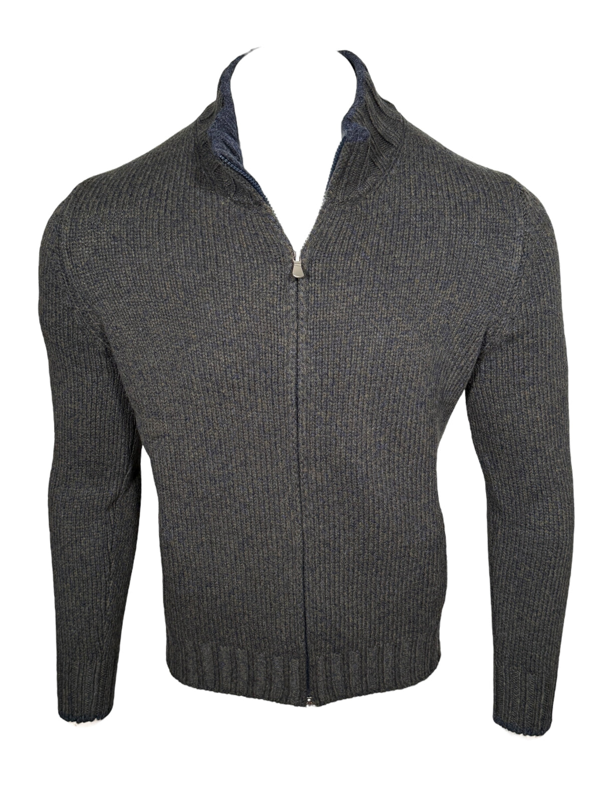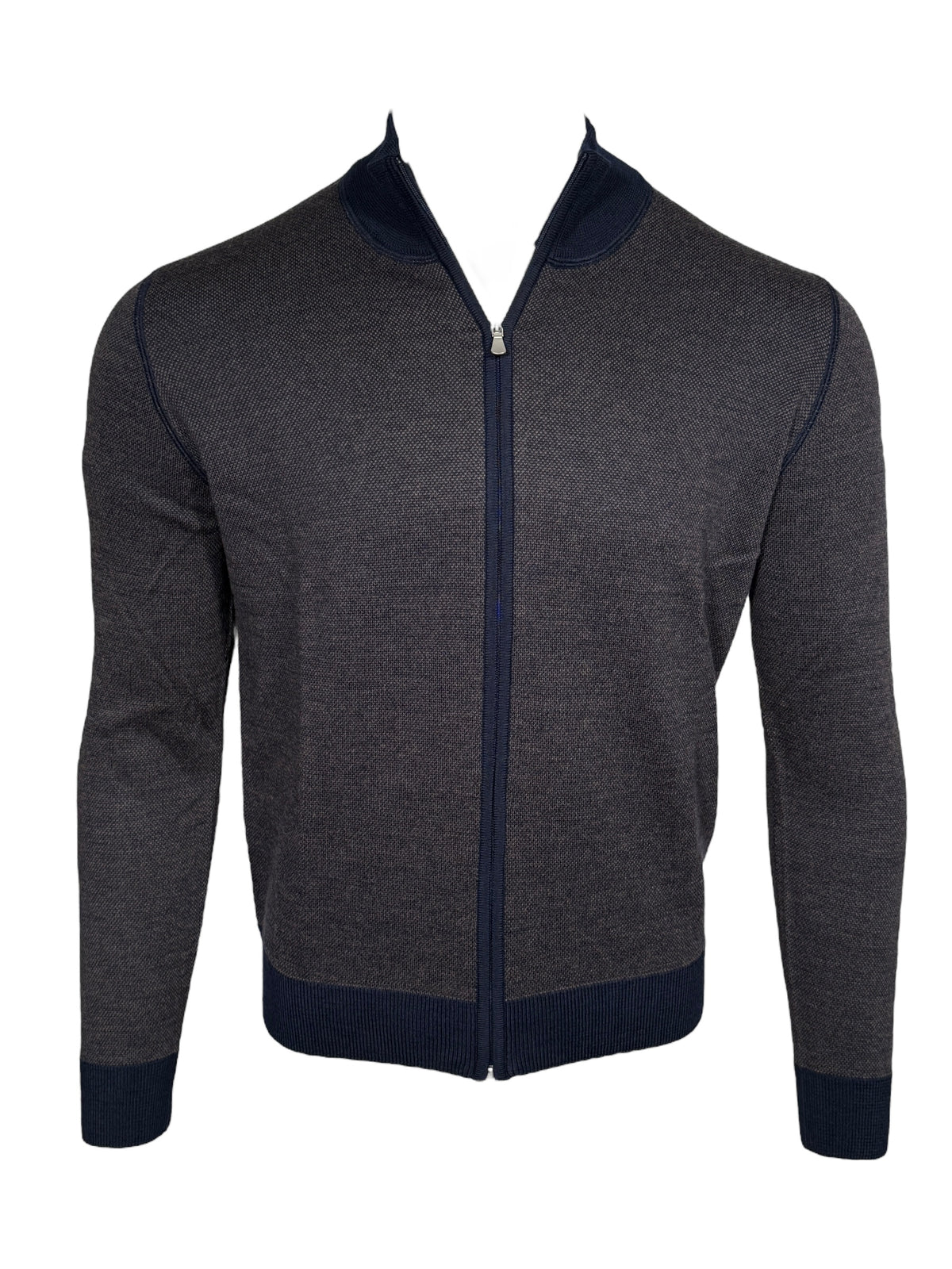 BUTTON DOWN BIRDSEYE FULL ZIP SWEATER - BROWN/NAVY