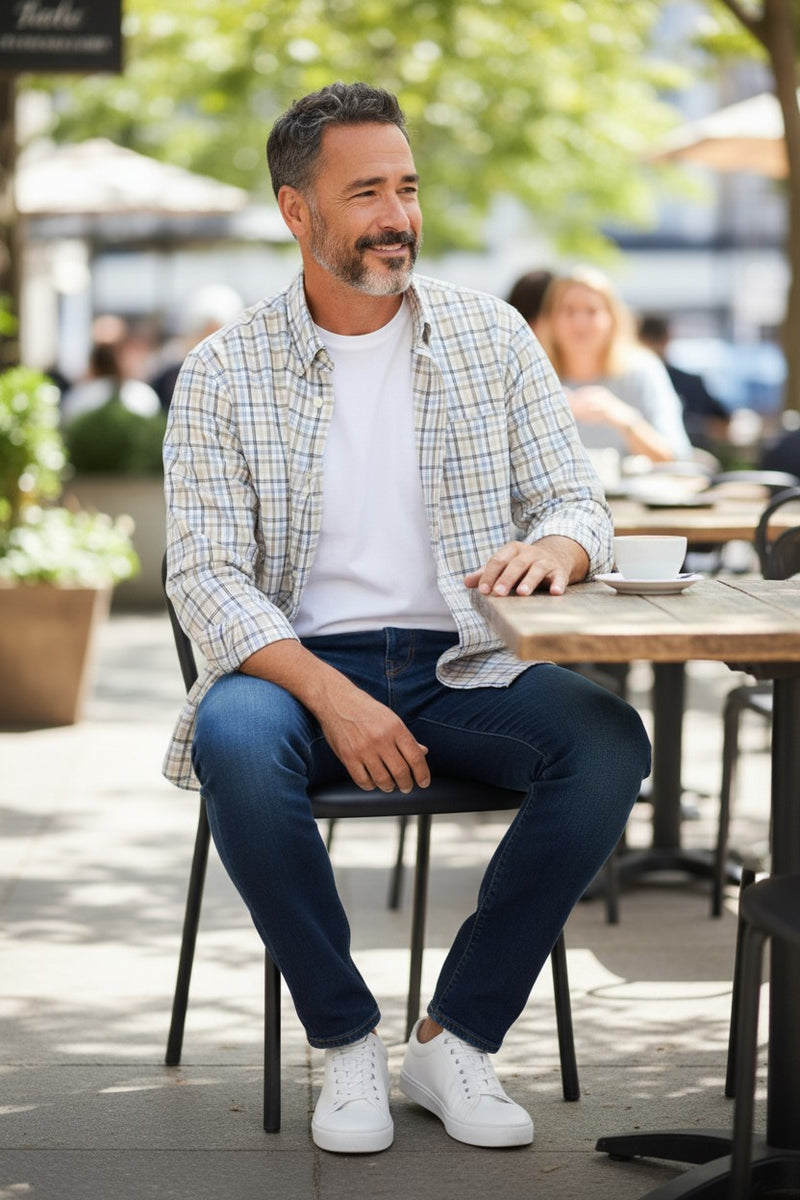 ALAN PAINE LINEN/COTTON SPORT SHIRT - NAVY/BLUE/TAN DOUBLE CHECK