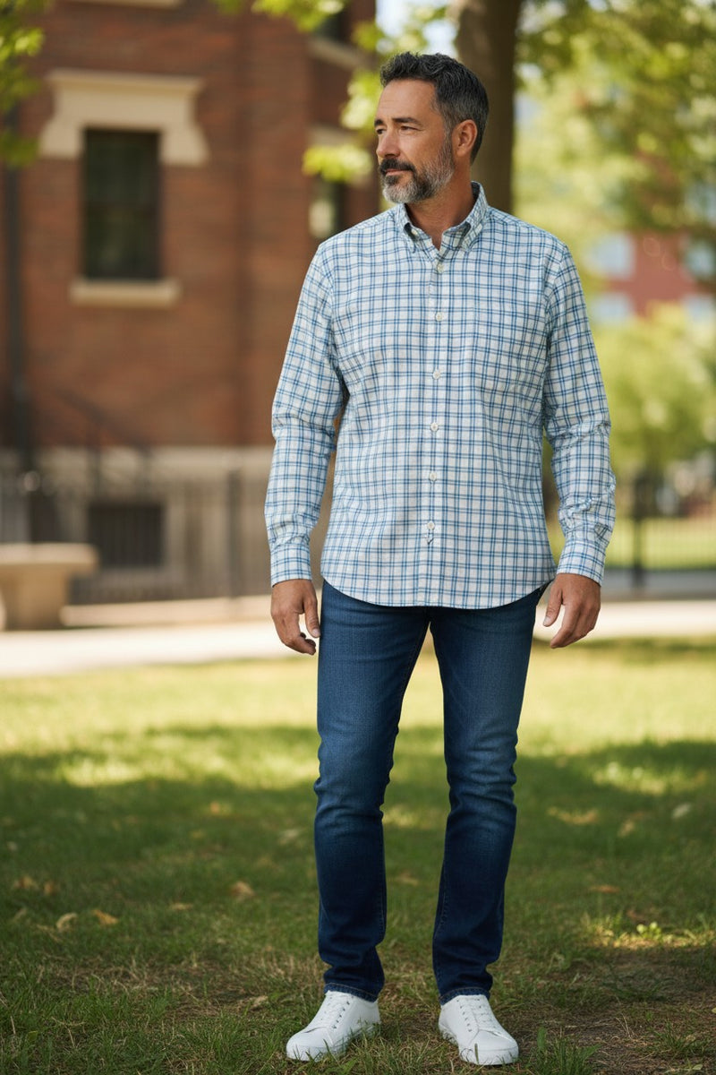ALAN PAINE COTTON SPORT SHIRT - BLUE/TEAL DOUBLE CHECK