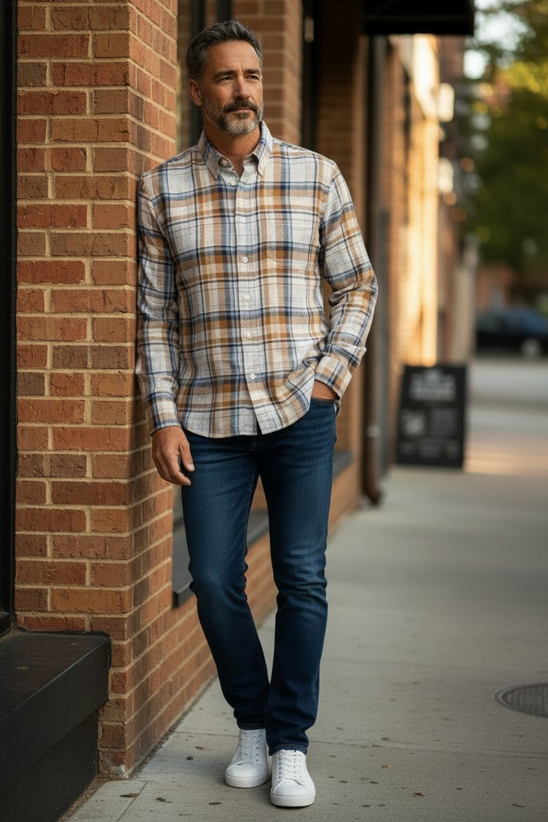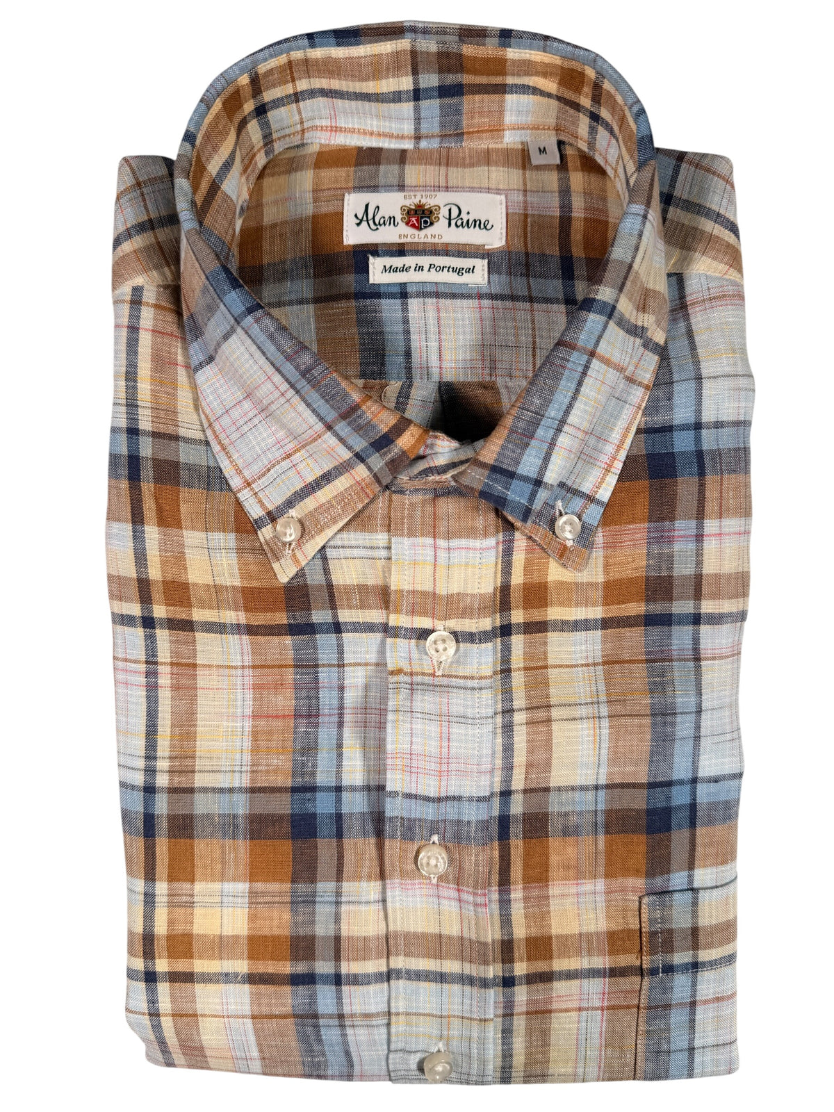 ALAN PAINE LINEN SPORT SHIRT - BROWN/BLUE PLAID